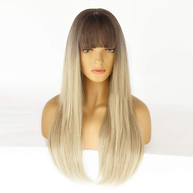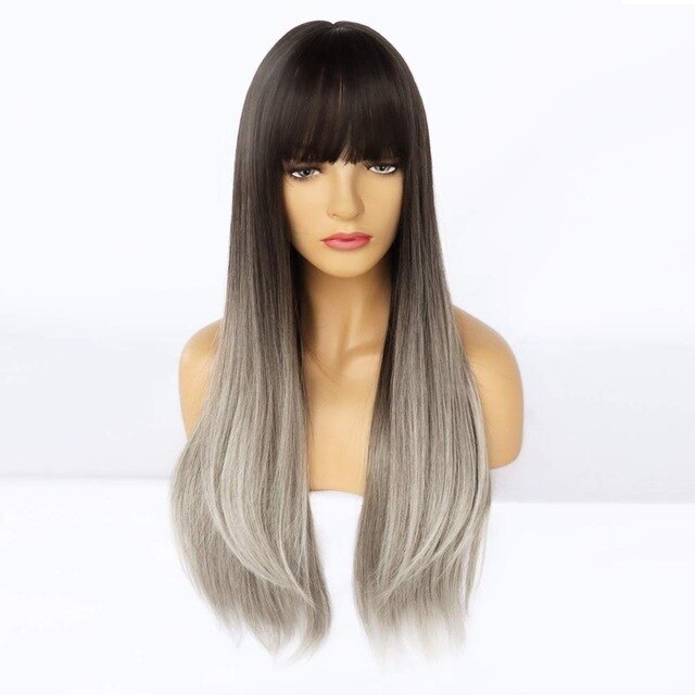 Long Synthetic Wig with Bangs Dark Root Ombre Color